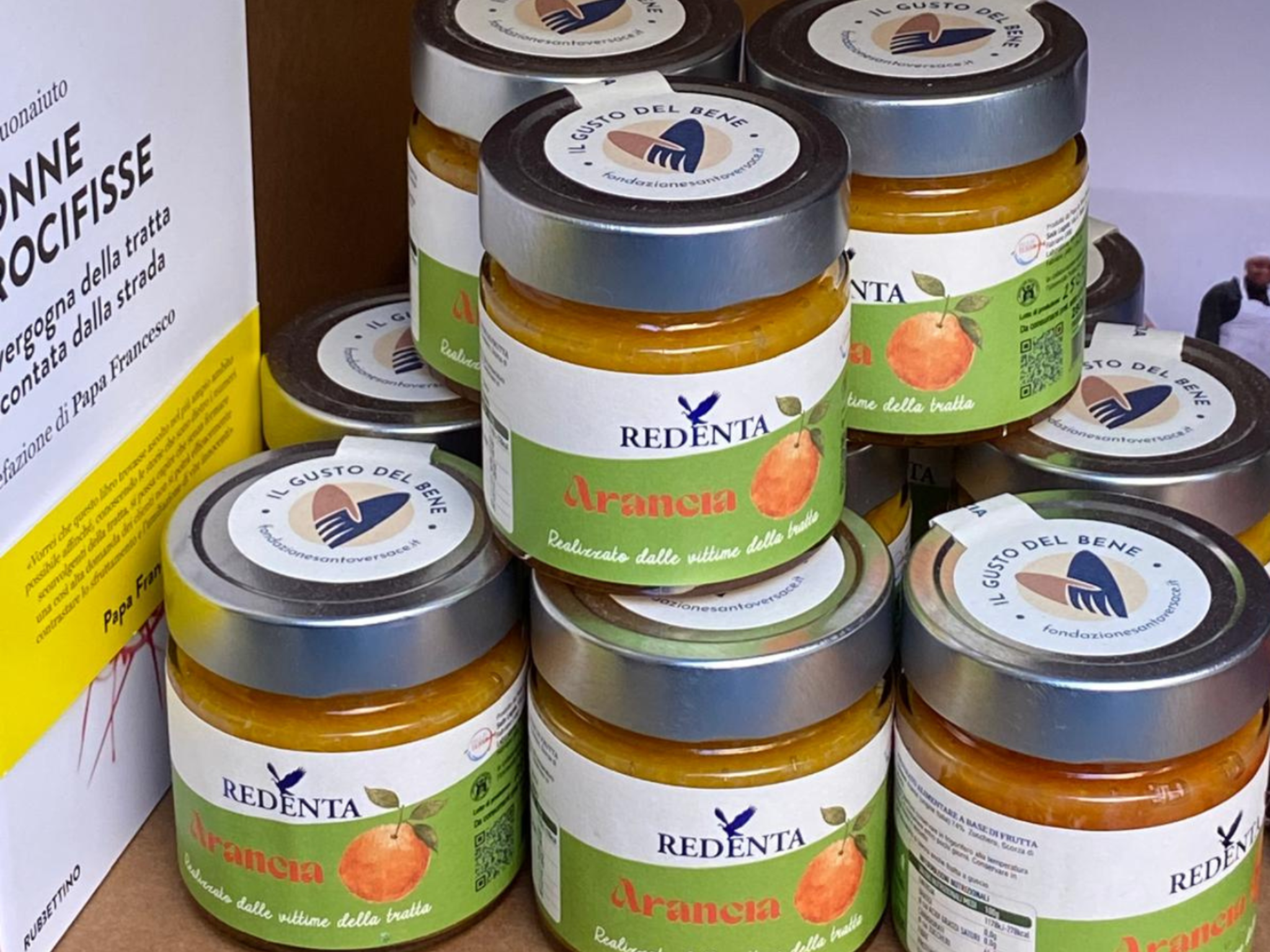 Le marmellate “Redenta” sono prodotte con frutta, stagionale fornita da consorzi agricoli italiani che viene selezionata a mano con cura e preparata per la lavorazione. Ogni passaggio fino all’invasettatura e all’etichettatura è svolto con cura artigianale e con la massima attenzione alla qualità del prodotto dalle donne guidate sempre da Nonna Marina, la corresponsabile della Casa Famiglia Rifugio della Comunità Papa Giovanni XXIII che ha lasciato le comodità della propria casa, per mettersi in gioco ogni giorno e diventare la mamma e la nonna di queste ragazze e dei loro bambini, che con molto coraggio, scelgono di essere aiutate per poter scappare da una vita di sofferenza.